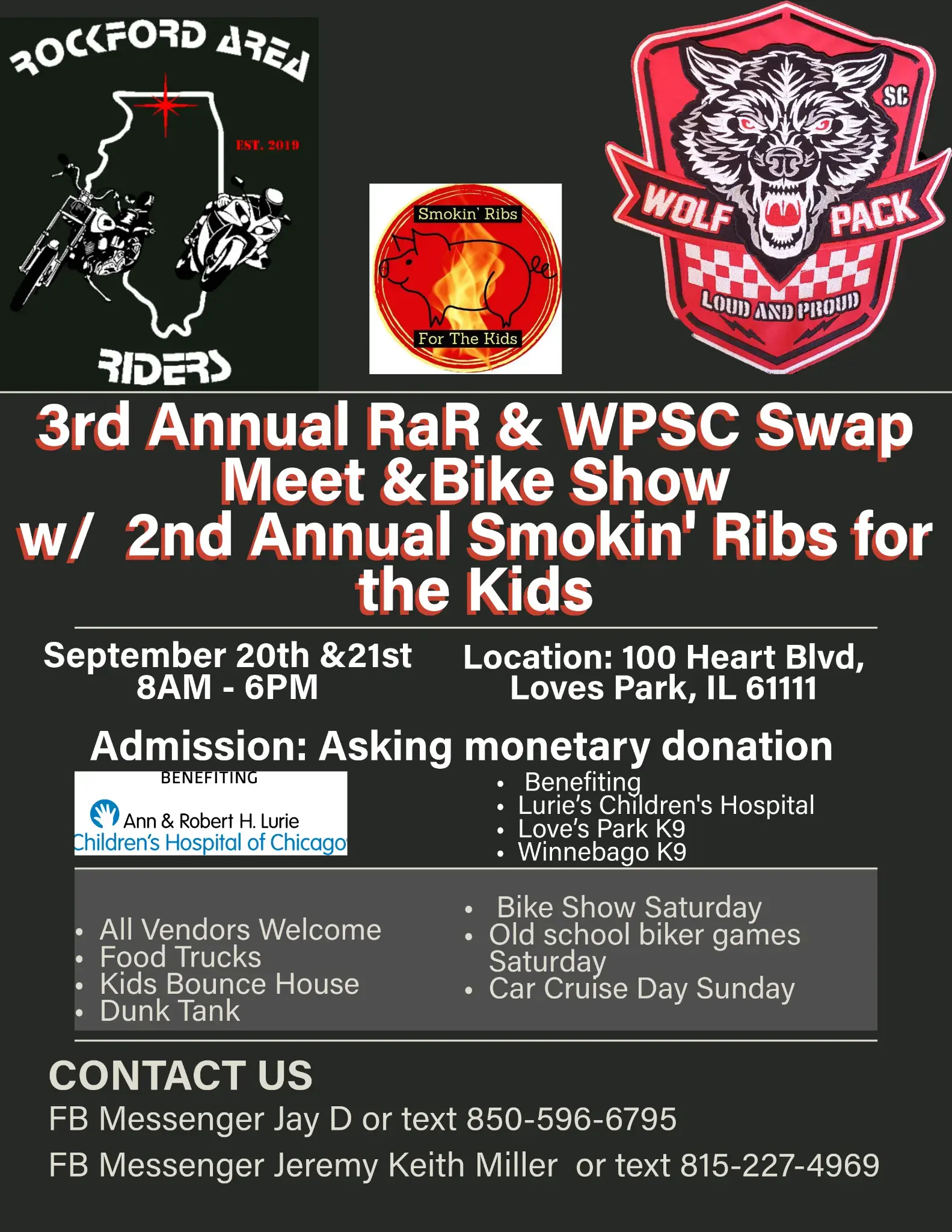This weekend is Rockford Area Riders, Wolfpack Social Clubs 3rd annual motorcycle swapmeet we will have vendors, food trucks, bike parts, biker games, bike show , bouncy house for the kids and tons more to do…