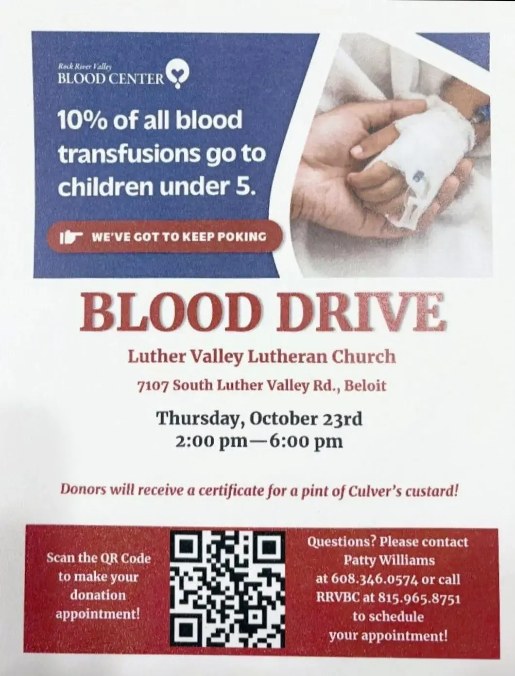 BLOOD DRIVE Luther Valley Church 7107 Luther Valley Rd Beloit Wisconsin Walk-ins are Welcome