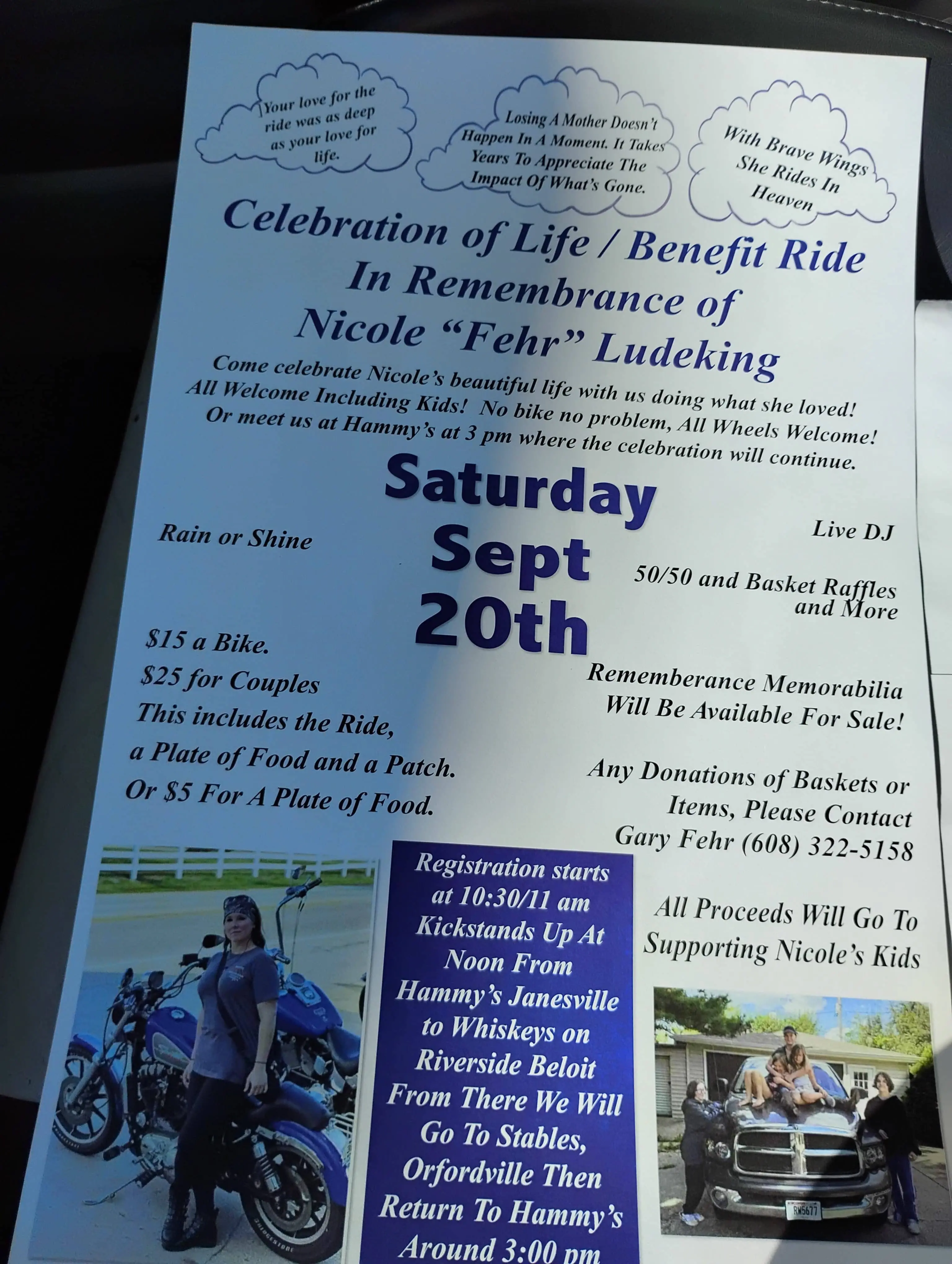 Celebration of life benefit fund raiser and ride everyone is welcome my daughter Nicole unexpectedly passed away Aug 17th doing what she loved most riding her harley.she left behind 5 children 6 to 20 years old the oldest is stepping up and will be raising her siblings.she had no insurance so we are having the BENIFIT to raise money to cover funeral home expense and to assist her with money to help raise the children all info is on the flyer there is also a go fund me on her obituary Nicole fehr ludeking all donations are appreciated stop out and win some amazing prizes and thank you everyone that has already donated