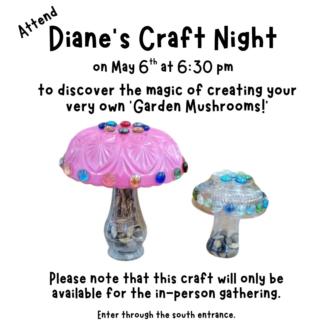 Attend Diane’s Craft Night on May 6th at 6:30 p.m. to discover the magic of creating your very own ‘Garden Mushrooms!’