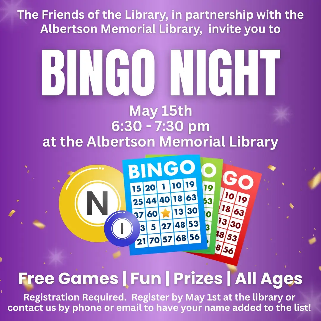 The Friends of the Library, in partnership with the Albertson Memorial Library, invite you to our Bingo Night on May 15, 2026, from 6:30 to 7:30 p.m. Enjoy an evening filled with games, fun, and prizes, and the best part? It’s absolutely free!