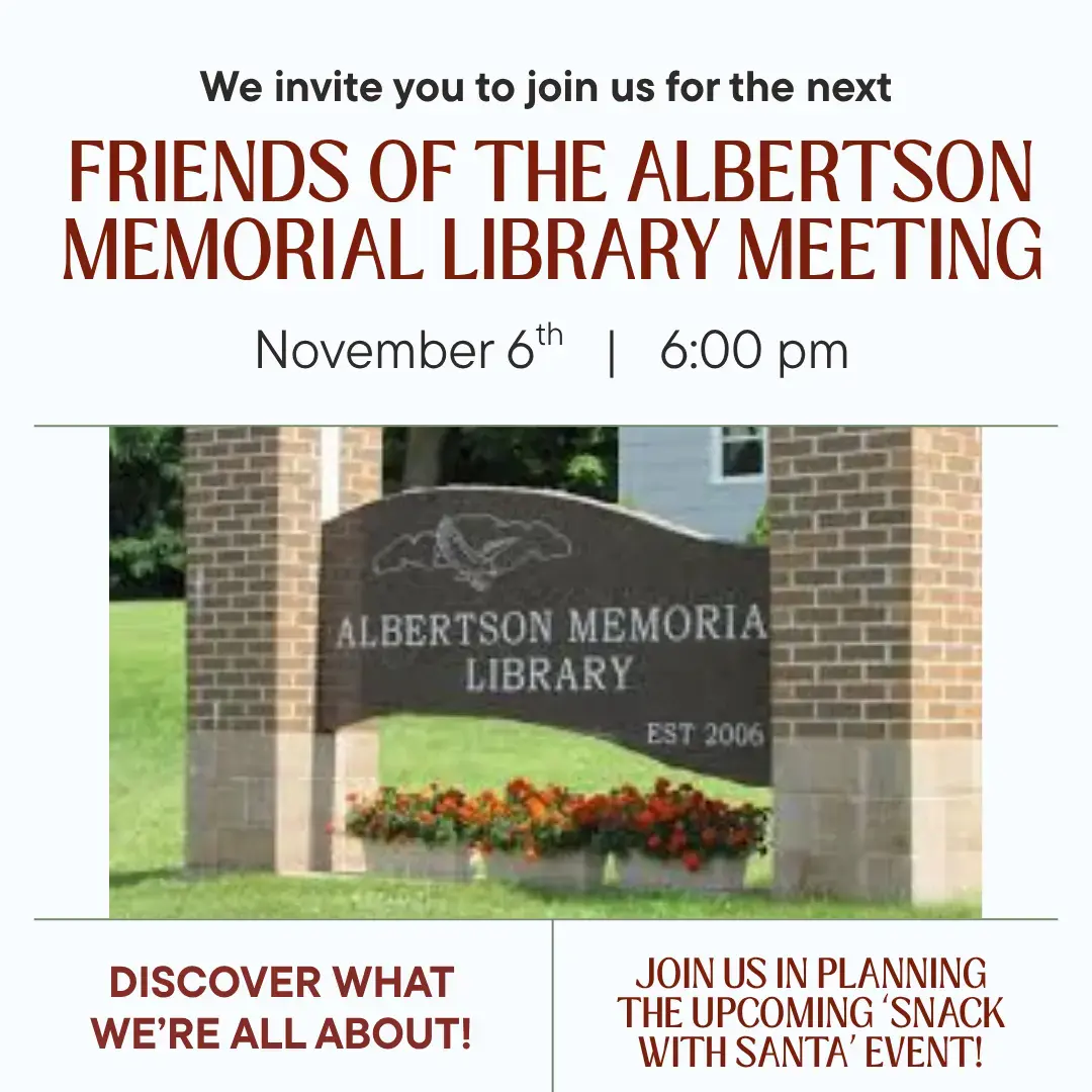 We invite you to join us for the next Friends of the Albertson Memorial Library meeting on November 6th at 6 pm. Discover what we are all about while helping us plan the library’s upcoming ‘Snack with Santa’ event!