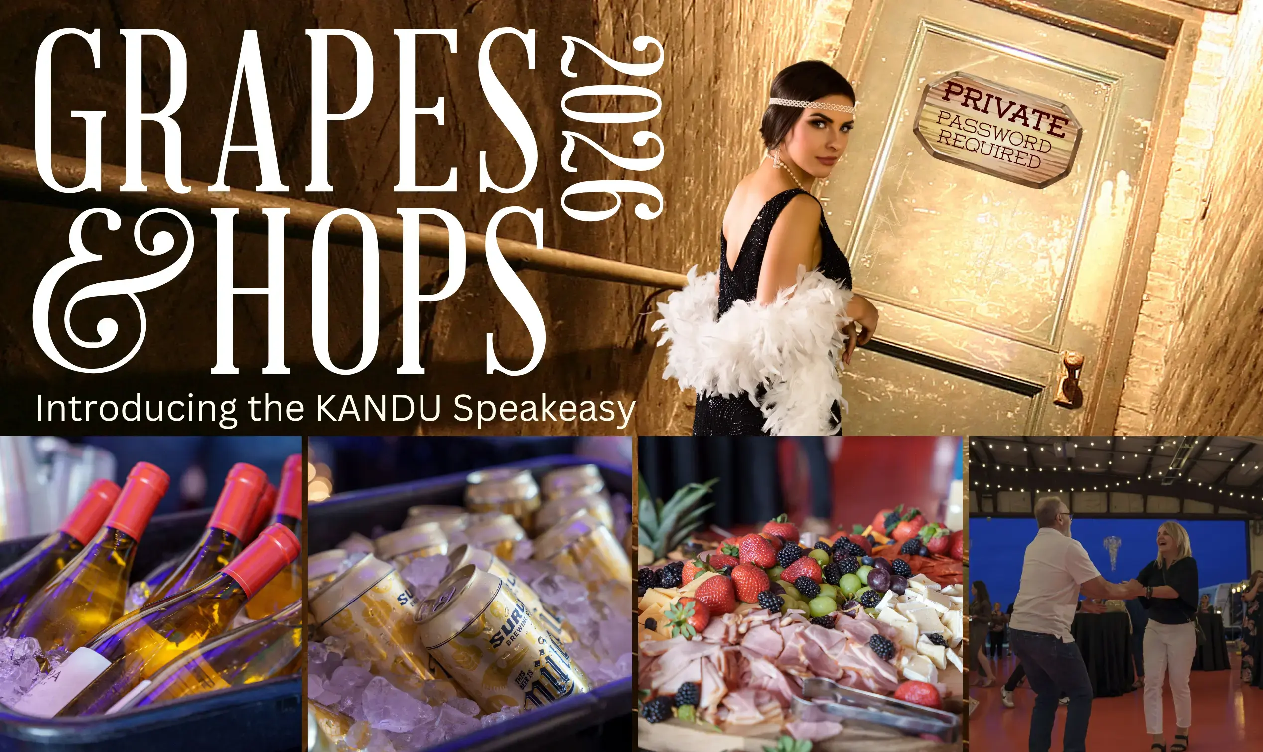 Introducing this year’s Grapes & Hops theme — the KANDU Speakeasy! The event you’ve known and loved for over a decade returns with an exciting new twist. Step behind closed doors and into a prohibition-era experience unlike anything before. Guests will explore speakeasy-themed tasting booths while sampling a curated selection of specialty wine and beer poured by local celebrities, all set within an engaging and unforgettable atmosphere. Dress the part and enjoy an evening of live music from crowd favorite Tony Ocean & the Main Event Band, interactive wine and beer tasting bars, spectacular food, and a roaring ’20s speakeasy vibe — with proceeds benefiting KANDU’s mission of creating, promoting, and providing diverse opportunities for people with disabilities or disadvantages and offering them the ability to pursue greater independence and explore their limitless potential.