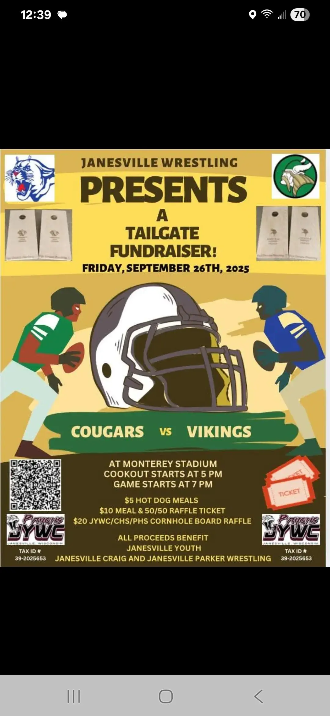 We will be selling hotdogs chips, water and baked goods before Craig/Parker football game at Monterey Stadium. Raffling off 3 custom sets of corn hole boards that say Craig, Parker and JYWC. Also doing 50-50 raffle. All money raised goes to Craig, Parker and Janesville Youth Wrestling Clubs