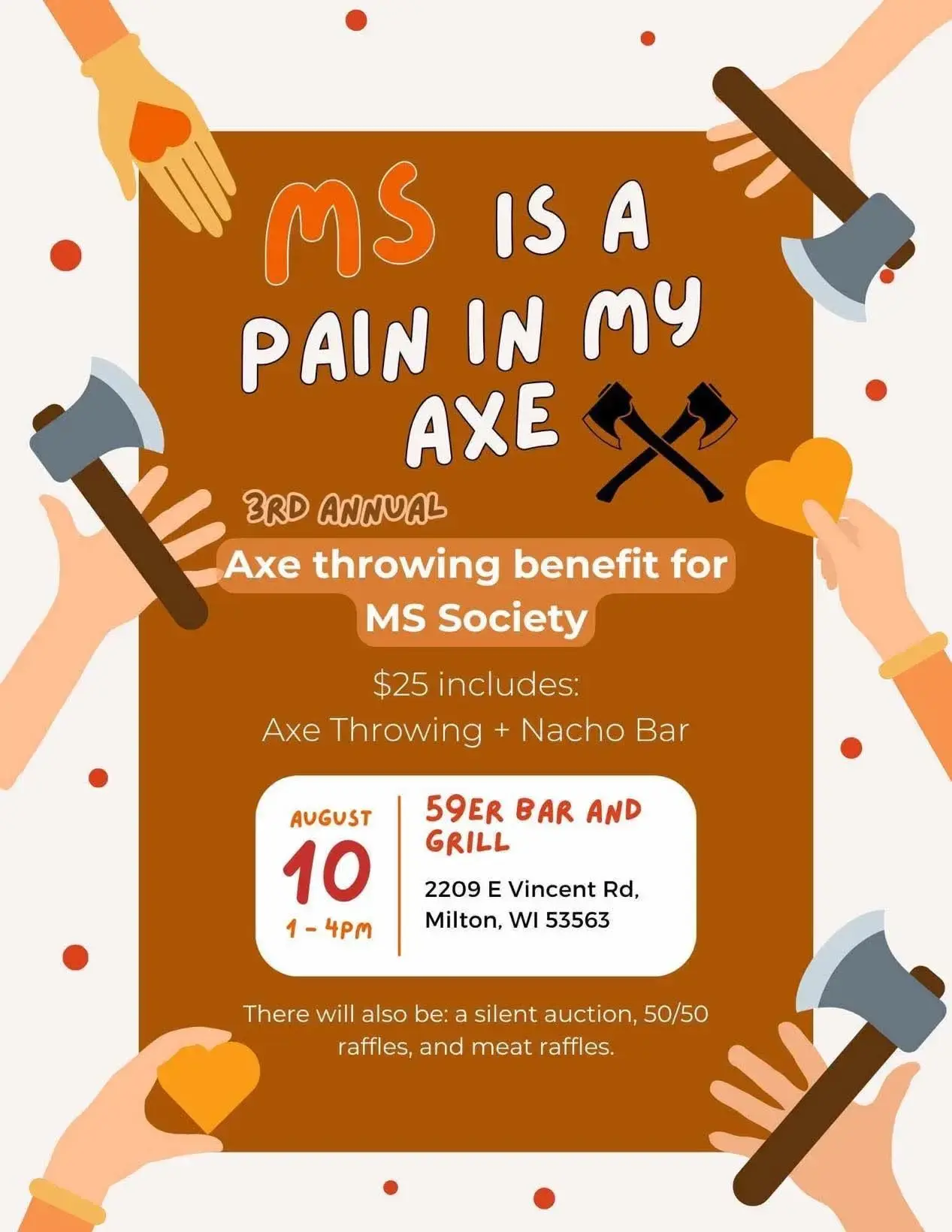 This is the third annual axe throwing fundraiser event for the multiple sclerosis society It will be held at the 59er bar and grill in Milton Wisconsin. The cost will be $25 for the extra throwing event and this will include a nacho bar. There will be 50-50 raffles, meat raffles, and a silent auction please, come and join us to help the MS Society cure this disease