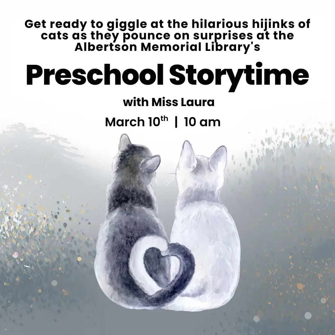 Get ready to giggle at the hilarious hijinks of cats as they pounce on surprises at the Albertson Memorial Library’s Preschool Storytime with Miss Laura on March 10th at 10 am.