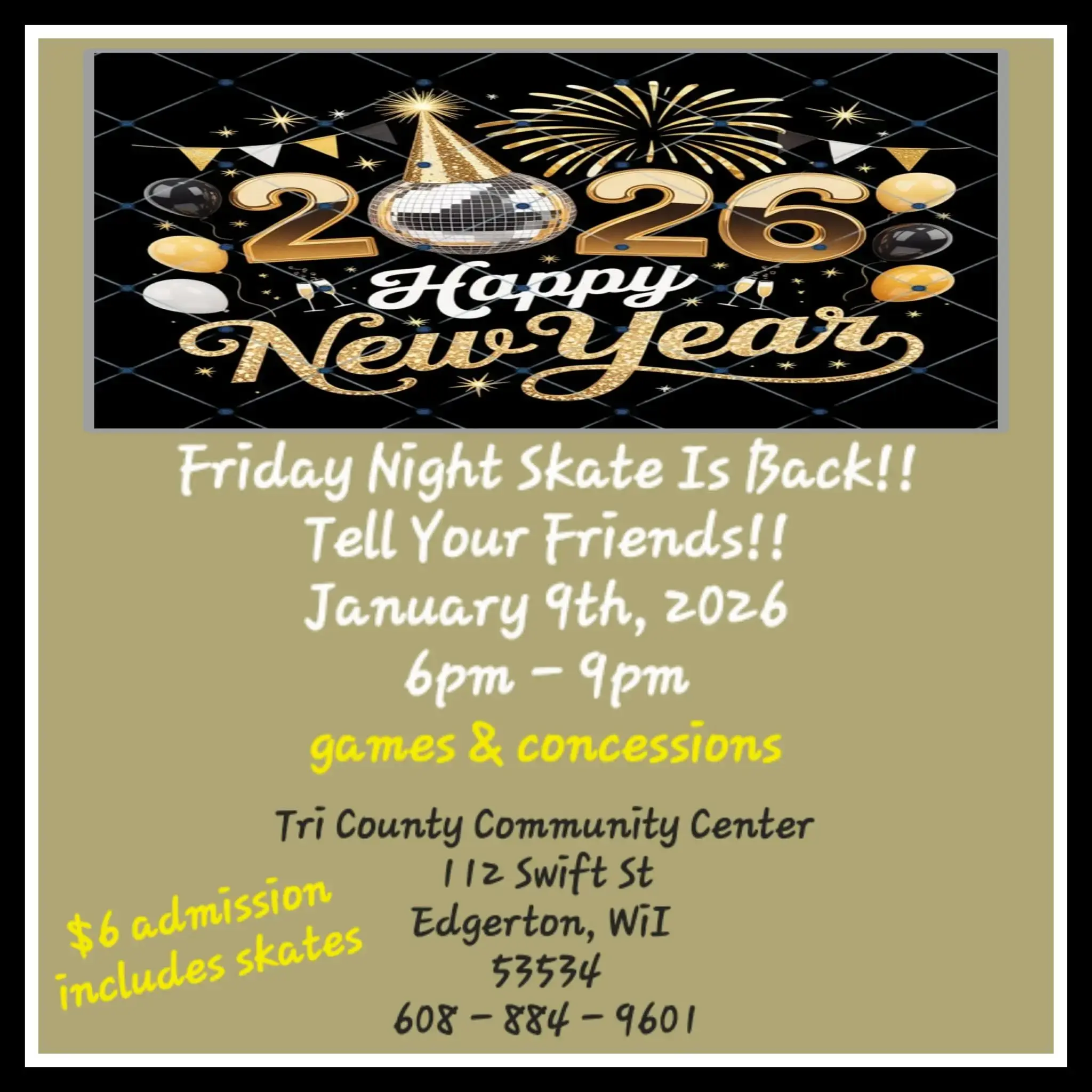 Edgerton’s Tri County Community center hosts roller skating for for all ages. Games, prizes and lots of fun! $6 admission also includes skates.