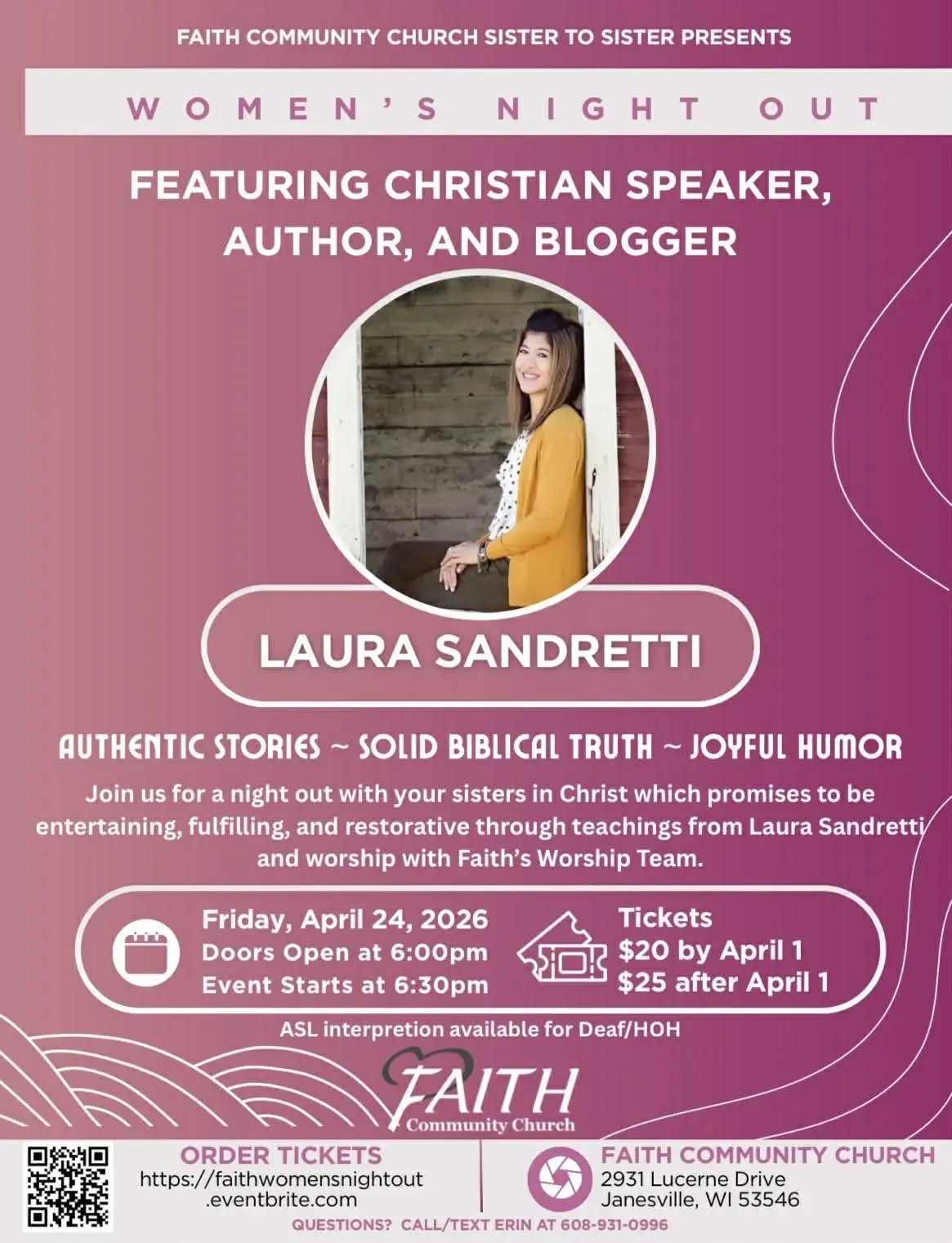 Join us for a night out with your sister in Christ. It promises to be an entertaining, fulfilling, and restorative evening through teachings from Laura Sandretti. Experience authentic stories, solid biblical truth and joyful humor. Come to Faith Community Church, 2931 Lucerne Drive, Janesville, WI on Friday, April 24th, 2026. Doors open at 6:00 pm and worship with our Faith Worship Team begins at 6:30pm. ASL interpretation available for the Deaf/HOH.