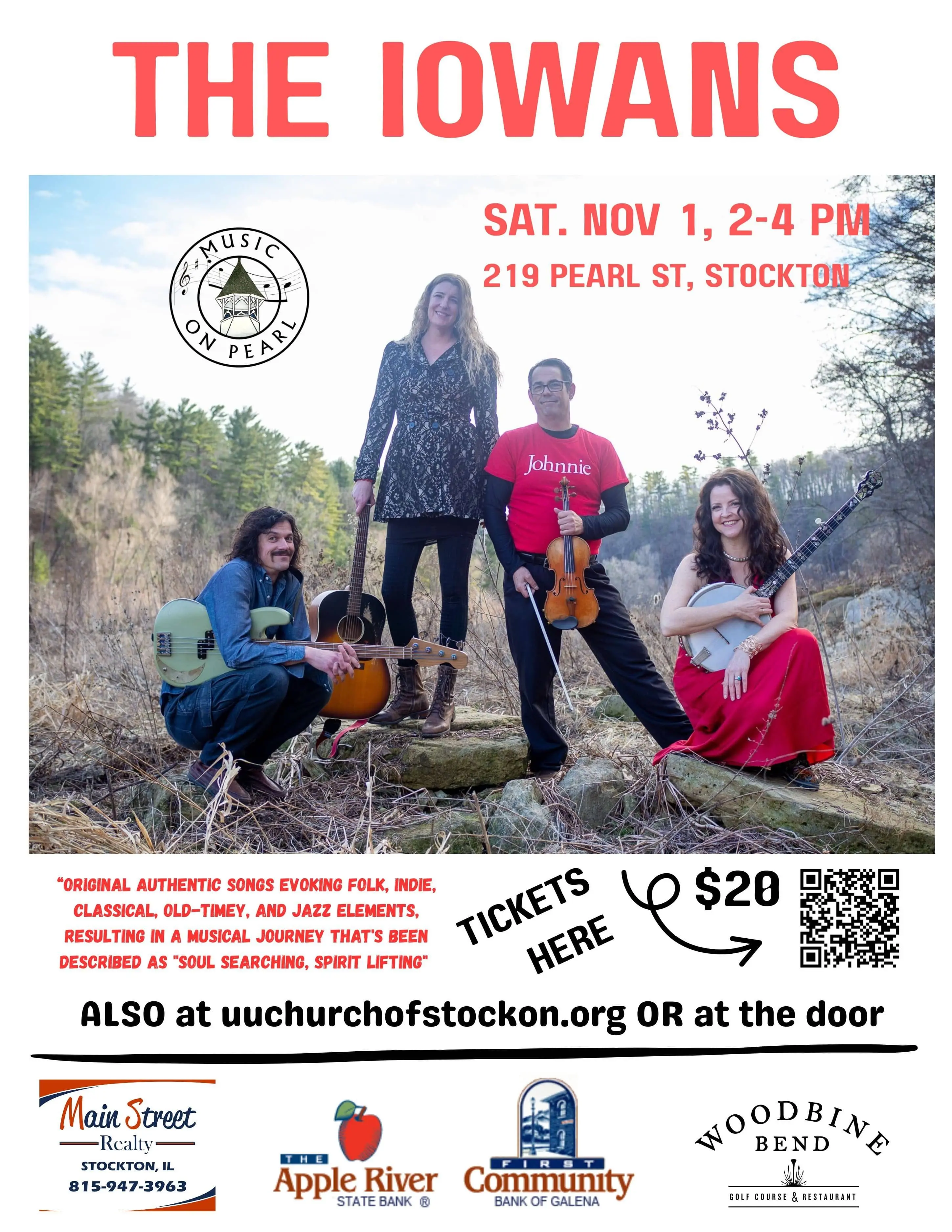 Music on Pearl invites you to attend our last concert of the year Saturday, November 1 from 2-4 pm at the Unitarian Universalist Church of Stockton at 219 N. Pearl in Stockton. The concert will feature the music of THE IOWANS, a 4 piece group featuring electric guitar, violin, and clawhammer banjo. You will be treated to a range of musical styles from folk, to classical, old-time, and jazz and they will delight you with their amazing harmonies and original…...