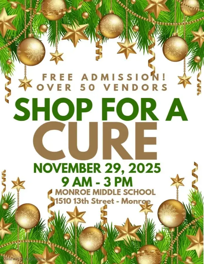The annual Shop For A Cure will take place at Monroe Middle School on Saturday, November 29th, from 9 a.m. to 3 p.m. Admission is free, and everyone is invited to attend. With over 50 vendors and crafters offering a variety of gifts and products, the event has expanded this year to include booths in both the gym and cafeteria. There will also be a bake sale, lunch stand, silent auction, and prize drawings. All proceeds benefit Relay For Life…...
