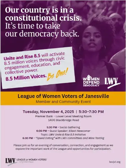 League of Women Voters-Janesville is planning a Unite & Rise/ Meet & Greet event for 5:30-7:30PM Tuesday, November 4, 2025, at the Premier Bank on Blackbridge Road, Janesville. It’s a great opportunity to learn about the League of Women Voters. From 5:30-6 will be a social time At 6pm Guest Speaker Eileen Newcomer from the Wisconsin League of Women Voters will be sharing information about the Leagues Unite and Rise 8.5 initiative. Her presentation will be followed by an opportunity&hel...